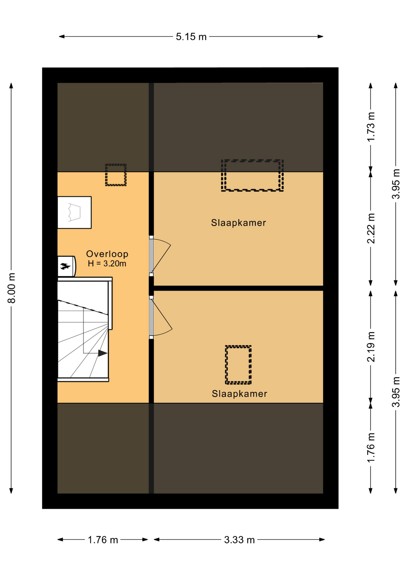 Overloop met opstelling CV-ketel en wassen/drogen, vierde slaapkamer (ca. 8 m²) met dakraam, vijfde slaapkamer (ca. 8 m²) met dakraam.